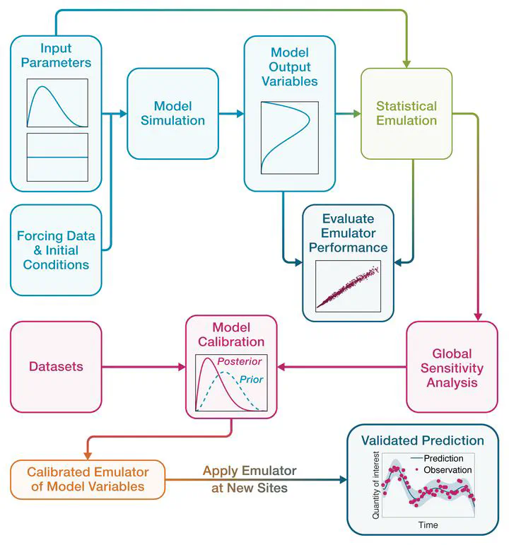 Our paper, “A Framework for Parametric and Predictive Uncertainty Quantification in the E3SM Land Model: Assessing Site and Observable Generalizability,” has been published in the Journal of Advances in Modeling Earth Systems (JAMES)! In this work, we develop an integrated uncertainty quantification framework that combines parameter perturbation experiments (PPE), statistical emulation, and Bayesian inference to efficiently constrain model parameters and improve predictive capability. Using FLUXNET data from multiple evergreen forest sites, we show that posterior parameter distributions vary substantially across sites and observables, even within the same plant functional type, highlighting the importance of context-dependent observational constraints. At the core of this study is a PPE–emulator–MCMC framework that enables scalable uncertainty propagation and Bayesian calibration, transforming traditionally computationally expensive workflows into tractable inference problems. By leveraging a Gaussian process emulator, the framework accelerates simulations by orders of magnitude and supports efficient sensitivity analysis, calibration, and probabilistic prediction. This framework further supports model–observation system co-design by enabling OSSE-informed optimal experimental design, helping identify the most informative observations for reducing uncertainty. It also demonstrates the potential of surrogate-based (AI/ML-enabled) approaches for accelerating uncertainty quantification in Earth system models, ultimately strengthening predictive capability for hydrologic and carbon-cycle processes relevant to climate–energy system planning. If you are interested, feel free to check out the paper or reach out to discuss!
